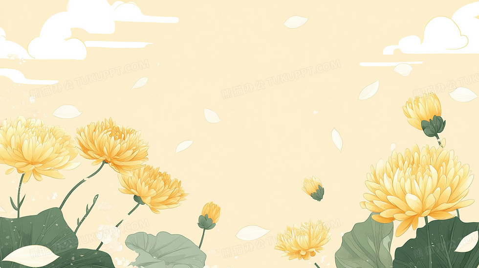 本作品内容为菊花重阳节传统节日简约背景, 格式为 jpg, 大小2 MB, 图片尺寸为2912 x 1632, 作品中背景图片无需修改, 源文件无水印,可以直接使用, 欢迎使用熊猫办公。 如认为平台内容涉嫌侵权,可通过邮件:tousu@tukuppt.com提出书面通知,我们将及时处理。