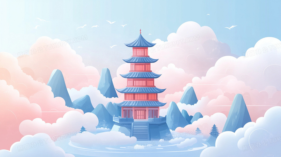 本作品内容为唯美云彩中式宝塔建筑插画, 格式为 jpg, 大小2 MB, 图片尺寸为2912 x 1632, 源文件无水印, 欢迎使用熊猫办公。 如认为平台内容涉嫌侵权,可通过邮件:tousu@tukuppt.com提出书面通知,我们将及时处理。