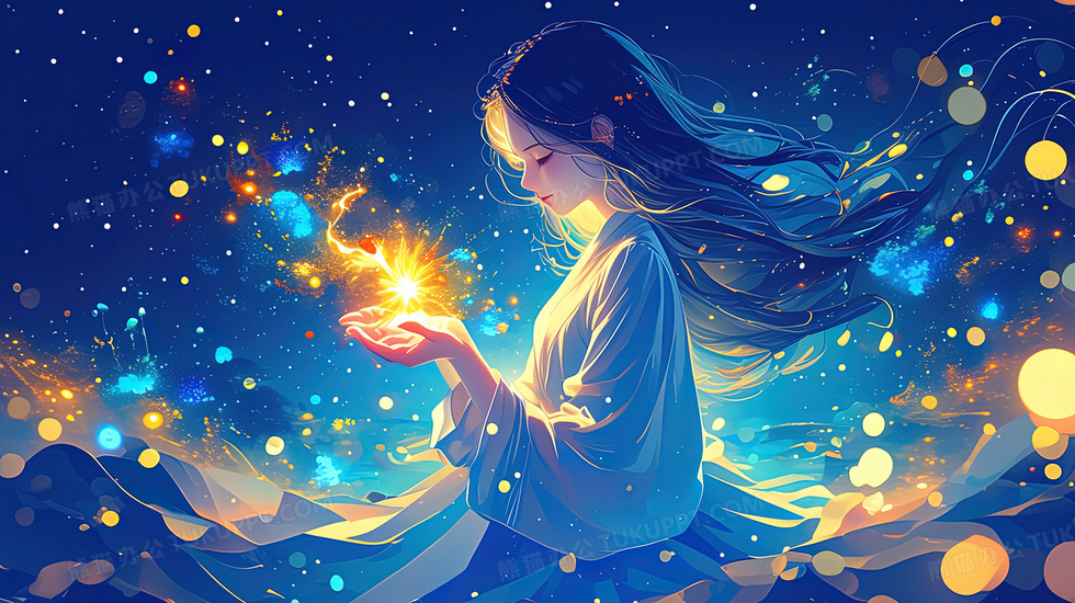 本作品内容为夜晚捧着星星的梦幻唯美女孩插画, 格式为 jpg, 大小6 MB, 图片尺寸为2912 x 1632, 源文件无水印, 欢迎使用熊猫办公。 如认为平台内容涉嫌侵权,可通过邮件:tousu@tukuppt.com提出书面通知,我们将及时处理。