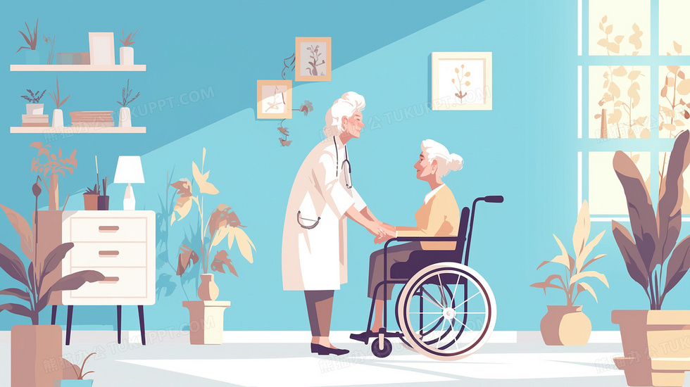 本作品内容为医生照顾生病坐轮椅的老人插画, 格式为 jpg, 大小2 MB, 图片尺寸为2912 x 1632, 源文件无水印, 欢迎使用熊猫办公。 如认为平台内容涉嫌侵权,可通过邮件:tousu@tukuppt.com提出书面通知,我们将及时处理。