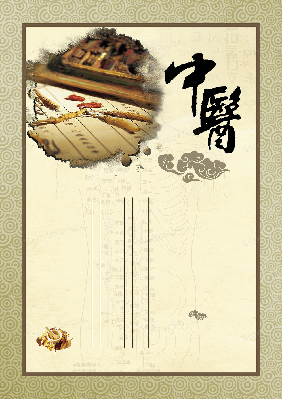 本作品内容为中医医疗大气背景, 格式为 psd, 图片尺寸为4583 x 6487, 作品中背景图片无需修改, 源文件无水印,可以直接使用, 欢迎使用熊猫办公。 如认为平台内容涉嫌侵权,可通过邮件:tousu@tukuppt.com提出书面通知,我们将及时处理。