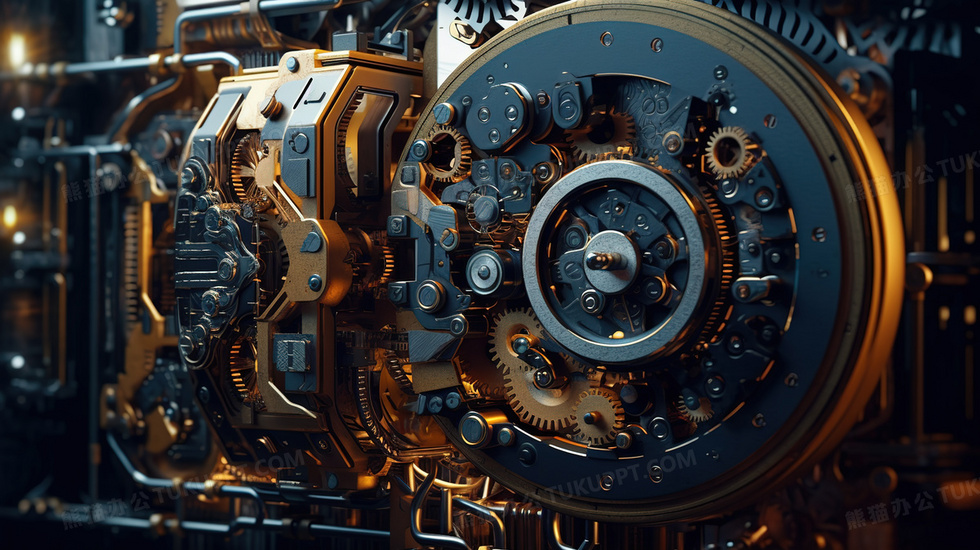 本作品内容为科技科幻智能化机械工业设备齿轮特写插画, 格式为 jpg, 大小6 MB, 图片尺寸为2912 x 1632, 源文件无水印, 欢迎使用熊猫办公。 如认为平台内容涉嫌侵权,可通过邮件:tousu@tukuppt.com提出书面通知,我们将及时处理。