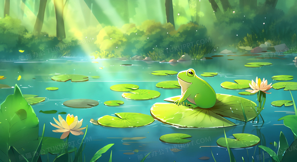 本作品内容为卡通风坐在荷叶上迎着阳光的青蛙插图, 格式为 jpg, 大小3 MB, 图片尺寸为2688 x 1464, 源文件无水印, 欢迎使用熊猫办公。 如认为平台内容涉嫌侵权,可通过邮件:tousu@tukuppt.com提出书面通知,我们将及时处理。