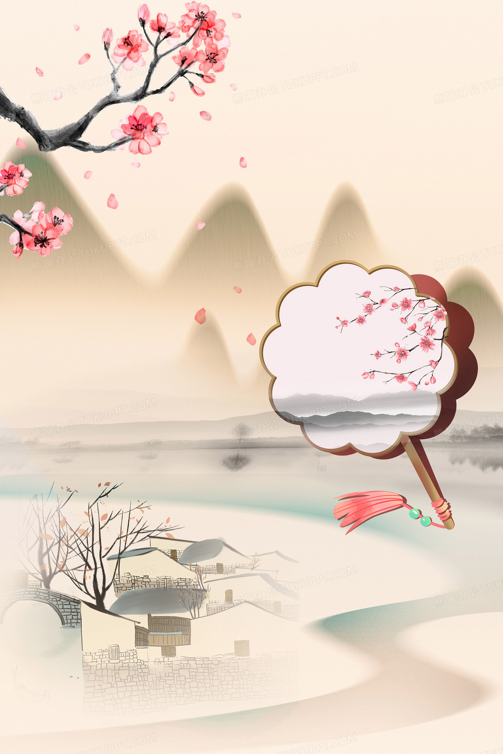 本作品内容为桃花团扇粉绿背景, 格式为 psd, 大小86 MB, 图片尺寸为3543 x 5314, 作品中背景图片无需修改, 源文件无水印,可以直接使用, 欢迎使用熊猫办公。 如认为平台内容涉嫌侵权,可通过邮件:tousu@tukuppt.com提出书面通知,我们将及时处理。