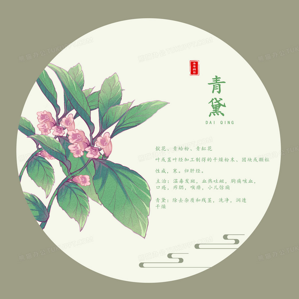 本作品内容为青黛中药植物说明介绍草药科普插画, 格式为 psd, 大小15 MB, 请使用软件PhotoShop(CC)打开, 源文件无水印, 欢迎使用熊猫办公。 如认为平台内容涉嫌侵权,可通过邮件:tousu@tukuppt.com提出书面通知,我们将及时处理。