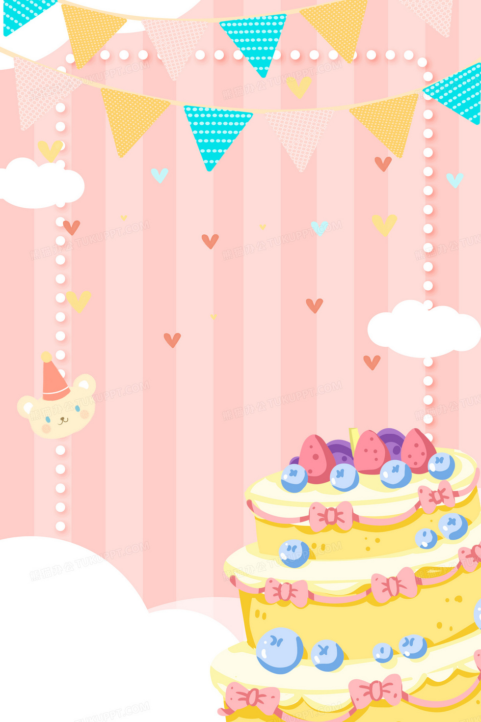 本作品内容为粉色生日蛋糕派对宣传卡通背景, 格式为 psd, 大小12 MB, 图片尺寸为3543 x 5315, 作品中背景图片无需修改, 源文件无水印,可以直接使用, 欢迎使用熊猫办公。 如认为平台内容涉嫌侵权,可通过邮件:tousu@tukuppt.com提出书面通知,我们将及时处理。