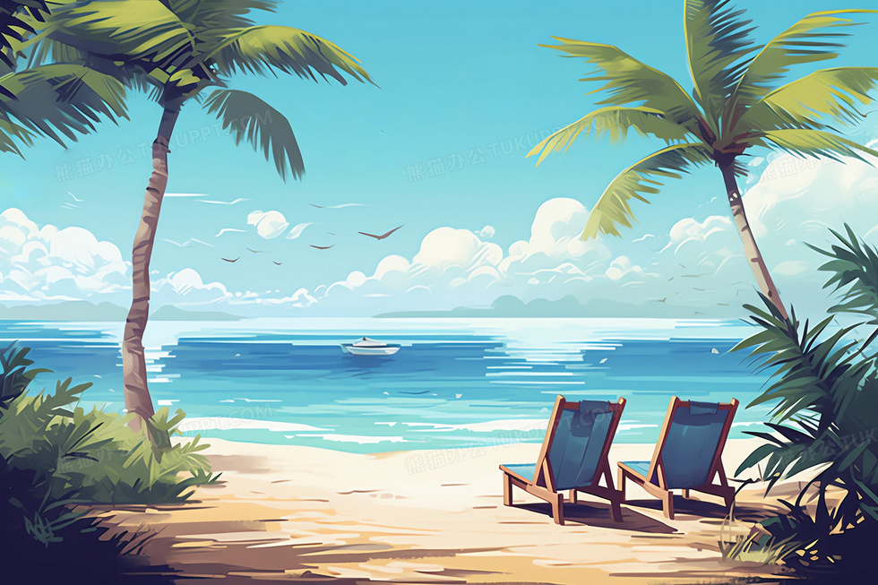 本作品内容为蓝天白云沙滩大海复古风夏日度假插画, 格式为 jpg, 大小4 MB, 图片尺寸为2688 x 1792, 源文件无水印, 欢迎使用熊猫办公。 如认为平台内容涉嫌侵权,可通过邮件:tousu@tukuppt.com提出书面通知,我们将及时处理。