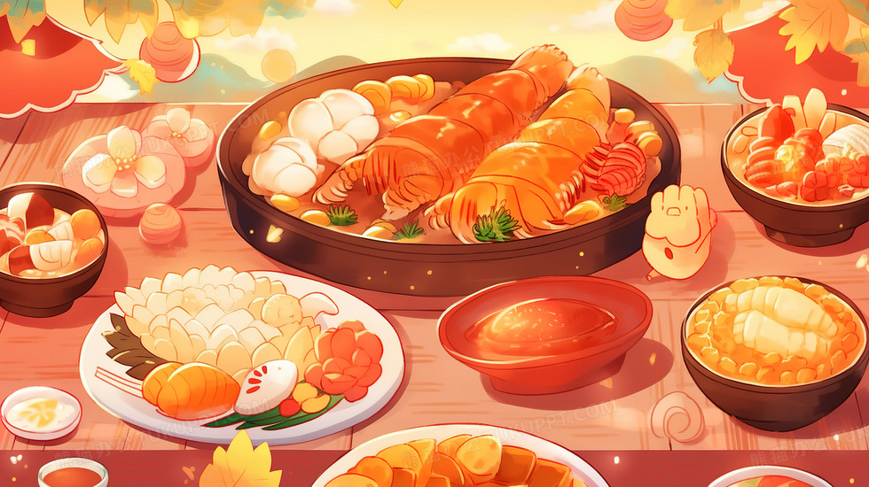本作品内容为快乐节日丰盛美味的菜肴插画, 格式为 jpg, 大小6 MB, 图片尺寸为2912 x 1632, 源文件无水印, 欢迎使用熊猫办公。 如认为平台内容涉嫌侵权,可通过邮件:tousu@tukuppt.com提出书面通知,我们将及时处理。
