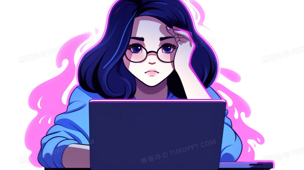 本作品内容为认真看笔记本电脑工作的女生插画, 格式为 jpg, 大小4 MB, 图片尺寸为2912 x 1632, 源文件无水印, 欢迎使用熊猫办公。 如认为平台内容涉嫌侵权,可通过邮件:tousu@tukuppt.com提出书面通知,我们将及时处理。