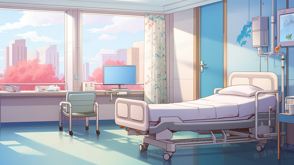 本作品内容为医院里明亮整洁的独立病房插画, 格式为 jpg, 大小4 MB, 图片尺寸为2912 x 1632, 源文件无水印, 欢迎使用熊猫办公。 如认为平台内容涉嫌侵权,可通过邮件:tousu@tukuppt.com提出书面通知,我们将及时处理。