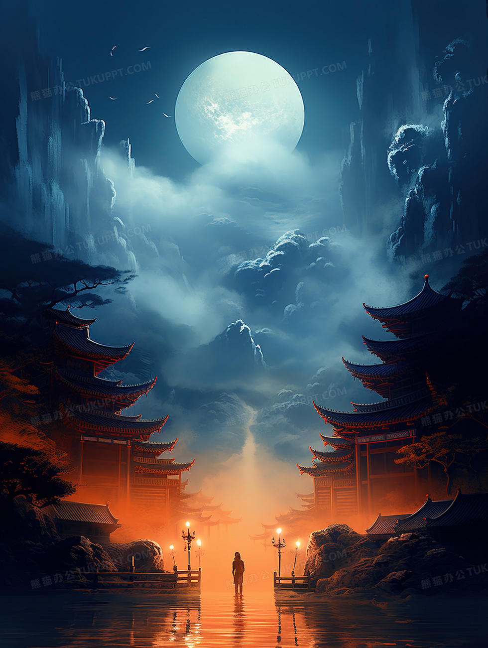 本作品内容为中国风夜晚山中楼阁建筑山水风景插画, 格式为 jpg, 大小5 MB, 图片尺寸为1856 x 2464, 源文件无水印, 欢迎使用熊猫办公。 如认为平台内容涉嫌侵权,可通过邮件:tousu@tukuppt.com提出书面通知,我们将及时处理。
