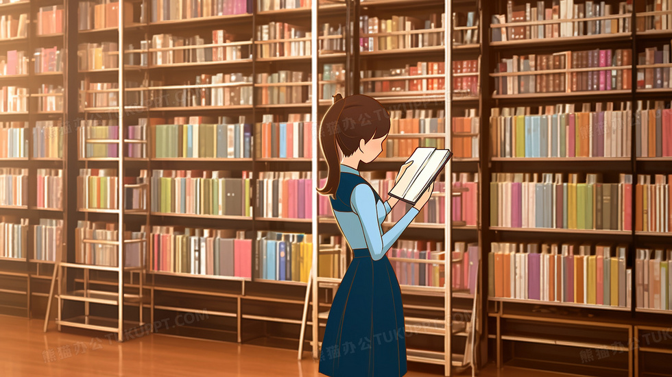 本作品内容为在图书室书架前看书的女生插画, 格式为 jpg, 大小3 MB, 图片尺寸为2912 x 1632, 源文件无水印, 欢迎使用熊猫办公。 如认为平台内容涉嫌侵权,可通过邮件:tousu@tukuppt.com提出书面通知,我们将及时处理。
