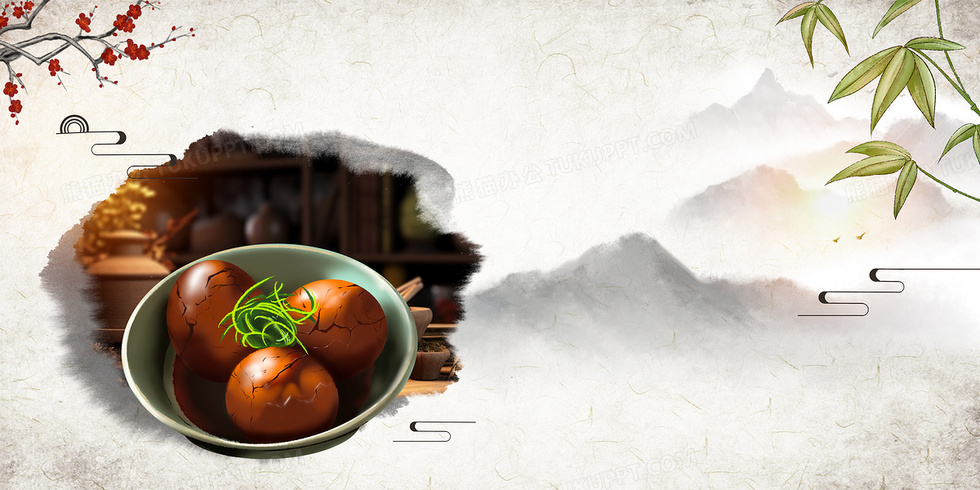本作品内容为茶叶蛋传统美食中国风背景, 格式为 psd, 大小70 MB, 图片尺寸为4724 x 2362, 作品中背景图片无需修改, 源文件无水印,可以直接使用, 欢迎使用熊猫办公。 如认为平台内容涉嫌侵权,可通过邮件:tousu@tukuppt.com提出书面通知,我们将及时处理。