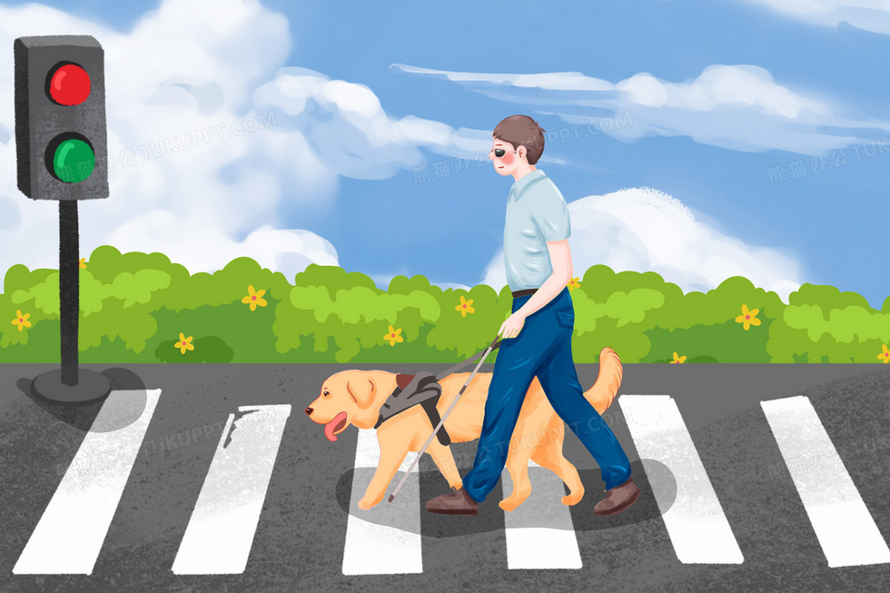 本作品内容为导盲犬帮助盲人过马路插画, 格式为 psd, 大小15 MB, 请使用软件PhotoShop(CC)打开, 源文件无水印, 欢迎使用熊猫办公。 如认为平台内容涉嫌侵权,可通过邮件:tousu@tukuppt.com提出书面通知,我们将及时处理。