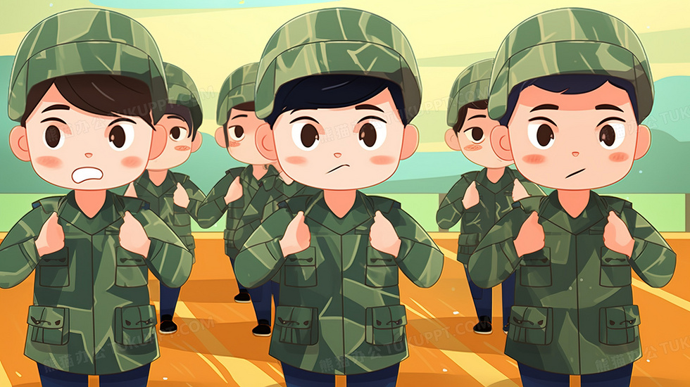 本作品内容为校园里穿着迷彩服参加军训的学生们插画, 格式为 jpg, 大小5 MB, 图片尺寸为2912 x 1632, 源文件无水印, 欢迎使用熊猫办公。 如认为平台内容涉嫌侵权,可通过邮件:tousu@tukuppt.com提出书面通知,我们将及时处理。