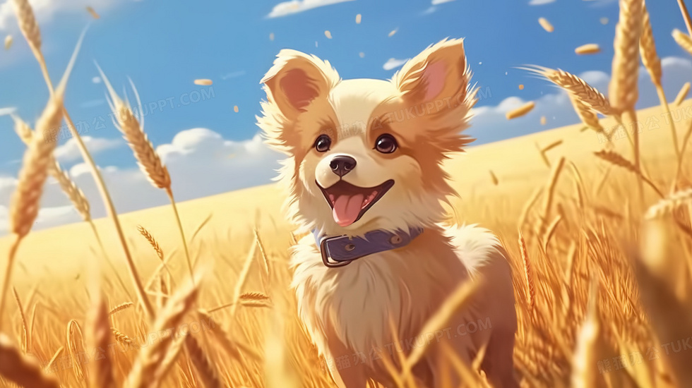 本作品内容为在成熟的金色麦田上玩耍的快乐小狗插画, 格式为 jpg, 大小5 MB, 图片尺寸为2912 x 1632, 源文件无水印, 欢迎使用熊猫办公。 如认为平台内容涉嫌侵权,可通过邮件:tousu@tukuppt.com提出书面通知,我们将及时处理。