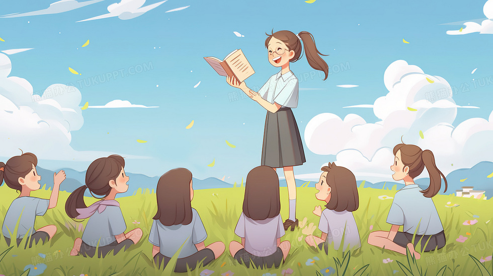 本作品内容为蓝天白云草地室外老师认真上课学生认真听课创意插画, 格式为 jpg, 大小5 MB, 图片尺寸为2912 x 1632, 源文件无水印, 欢迎使用熊猫办公。 如认为平台内容涉嫌侵权,可通过邮件:tousu@tukuppt.com提出书面通知,我们将及时处理。