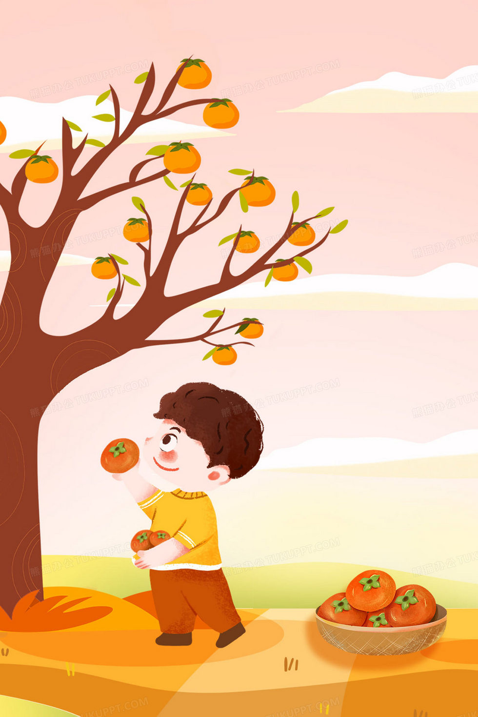 本作品内容为二十四节气霜降男孩摘柿子秋季卡通插画, 格式为 psd, 大小8 MB, 请使用软件PhotoShop(CC)打开, 源文件无水印, 欢迎使用熊猫办公。 如认为平台内容涉嫌侵权,可通过邮件:tousu@tukuppt.com提出书面通知,我们将及时处理。
