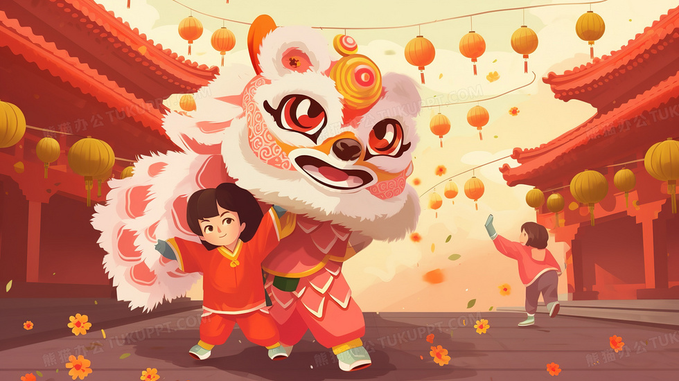本作品内容为春节庆典的小孩和醒狮插画, 格式为 jpg, 大小5 MB, 图片尺寸为2912 x 1632, 源文件无水印, 欢迎使用熊猫办公。 如认为平台内容涉嫌侵权,可通过邮件:tousu@tukuppt.com提出书面通知,我们将及时处理。