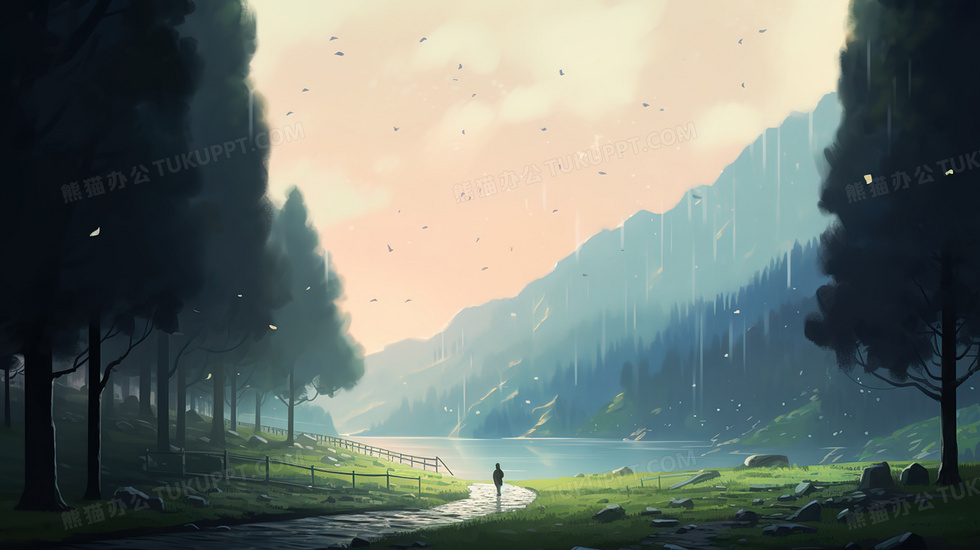 本作品内容为山谷树林湖泊的唯美雨景插画, 格式为 jpg, 大小4 MB, 图片尺寸为2912 x 1632, 源文件无水印, 欢迎使用熊猫办公。 如认为平台内容涉嫌侵权,可通过邮件:tousu@tukuppt.com提出书面通知,我们将及时处理。