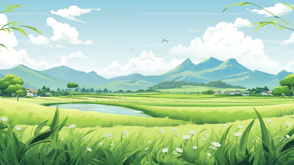 本作品内容为春季山边翠绿辽阔的水稻田插画, 格式为 jpg, 大小5 MB, 图片尺寸为2912 x 1632, 源文件无水印, 欢迎使用熊猫办公。 如认为平台内容涉嫌侵权,可通过邮件:tousu@tukuppt.com提出书面通知,我们将及时处理。
