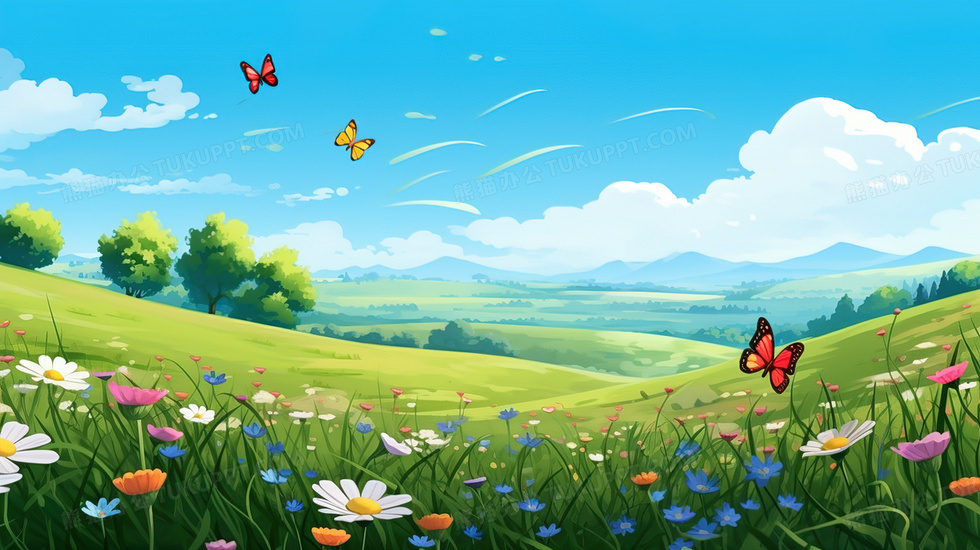 本作品内容为蓝天白云下的辽阔的花草原插画, 格式为 jpg, 大小6 MB, 图片尺寸为2912 x 1632, 源文件无水印, 欢迎使用熊猫办公。 如认为平台内容涉嫌侵权,可通过邮件:tousu@tukuppt.com提出书面通知,我们将及时处理。