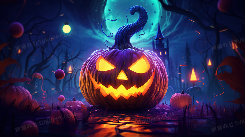 本作品内容为魔幻万圣节的南瓜灯笼插画, 格式为 jpg, 大小5 MB, 图片尺寸为2912 x 1632, 源文件无水印, 欢迎使用熊猫办公。 如认为平台内容涉嫌侵权,可通过邮件:tousu@tukuppt.com提出书面通知,我们将及时处理。