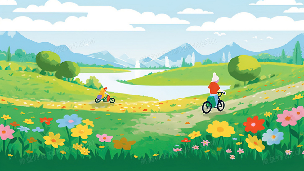 本作品内容为郊外湖边花丛草地上骑自行车的小孩插画, 格式为 jpg, 大小5 MB, 图片尺寸为2912 x 1632, 源文件无水印, 欢迎使用熊猫办公。 如认为平台内容涉嫌侵权,可通过邮件:tousu@tukuppt.com提出书面通知,我们将及时处理。