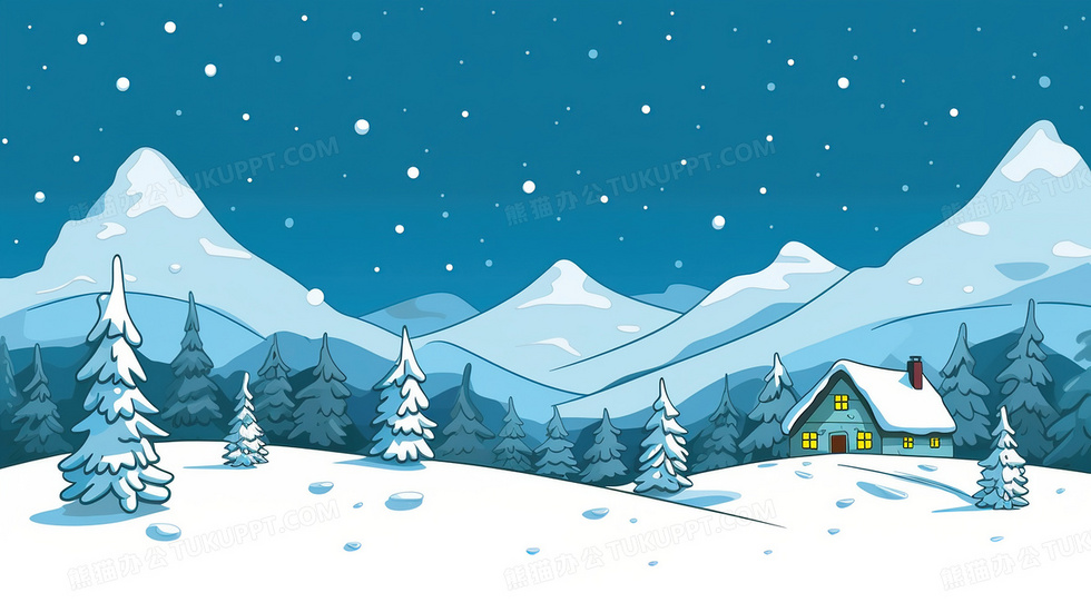 本作品内容为冬天雪中山林里的小木屋插画, 格式为 jpg, 大小4 MB, 图片尺寸为2912 x 1632, 源文件无水印, 欢迎使用熊猫办公。 如认为平台内容涉嫌侵权,可通过邮件:tousu@tukuppt.com提出书面通知,我们将及时处理。