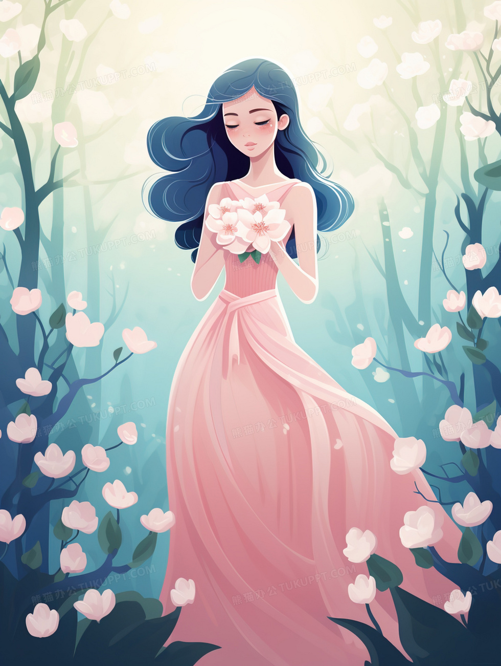 本作品内容为树林花朵中穿裙子的长发美女插画, 格式为 jpg, 大小4 MB, 图片尺寸为1856 x 2464, 源文件无水印, 欢迎使用熊猫办公。 如认为平台内容涉嫌侵权,可通过邮件:tousu@tukuppt.com提出书面通知,我们将及时处理。