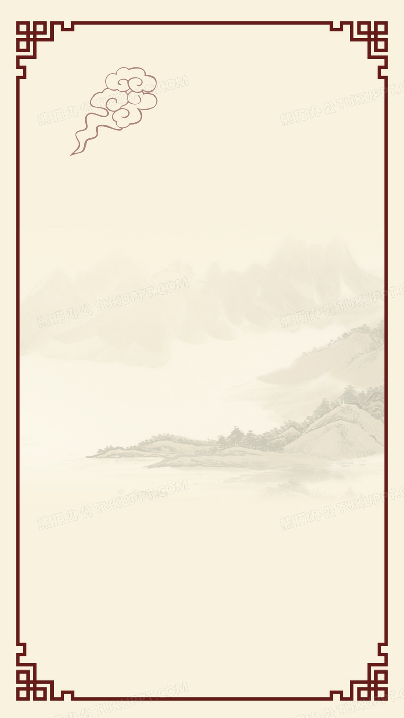 本作品内容为中国风远山边框矢量H5背景素材, 格式为 cdr, 图片尺寸为1080 x 1919, 作品中背景图片无需修改, 源文件无水印,可以直接使用, 欢迎使用熊猫办公。 如认为平台内容涉嫌侵权,可通过邮件:tousu@tukuppt.com提出书面通知,我们将及时处理。