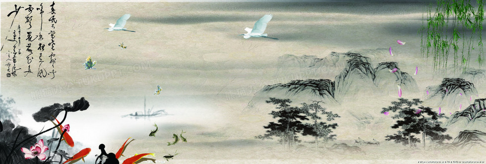 本作品内容为山水画鲤鱼柳树仙鹤诗词背景banner, 格式为 psd, 图片尺寸为1920 x 650, 作品中背景图片无需修改, 源文件无水印,可以直接使用, 欢迎使用熊猫办公。 如认为平台内容涉嫌侵权,可通过邮件:tousu@tukuppt.com提出书面通知,我们将及时处理。
