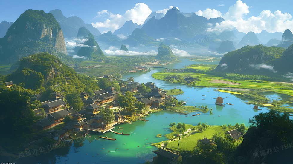 本作品内容为蓝天白云山水建筑风景插画, 格式为 jpg, 大小4 MB, 图片尺寸为2912 x 1632, 源文件无水印, 欢迎使用熊猫办公。 如认为平台内容涉嫌侵权,可通过邮件:tousu@tukuppt.com提出书面通知,我们将及时处理。