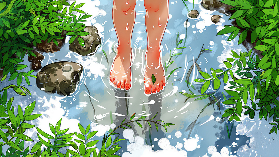 本作品内容为踩水的脚部特写插画, 格式为 jpg, 大小5 MB, 图片尺寸为2912 x 1632, 源文件无水印, 欢迎使用熊猫办公。 如认为平台内容涉嫌侵权,可通过邮件:tousu@tukuppt.com提出书面通知,我们将及时处理。