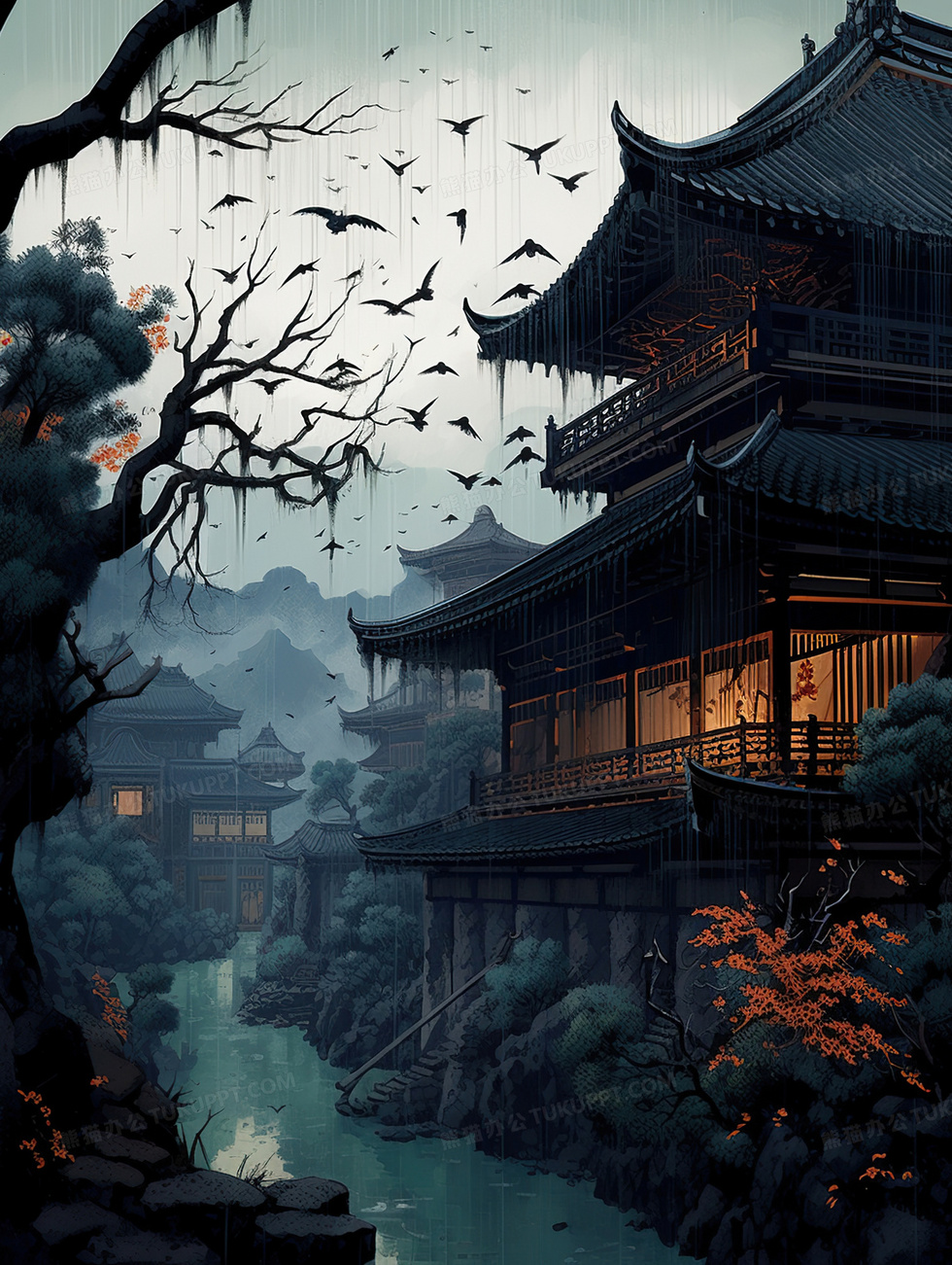 本作品内容为中国风古风山水建筑插画, 格式为 jpg, 大小3 MB, 图片尺寸为1856 x 2464, 源文件无水印, 欢迎使用熊猫办公。 如认为平台内容涉嫌侵权,可通过邮件:tousu@tukuppt.com提出书面通知,我们将及时处理。