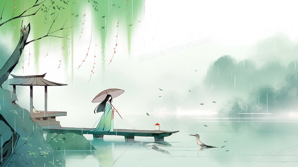 本作品内容为雨水天气一绿衣女子撑着伞在河边船渡口等人水墨画插画, 格式为 jpg, 大小2 MB, 图片尺寸为2912 x 1632, 源文件无水印, 欢迎使用熊猫办公。 如认为平台内容涉嫌侵权,可通过邮件:tousu@tukuppt.com提出书面通知,我们将及时处理。