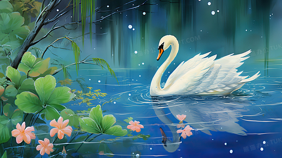 本作品内容为唯美春天风景池塘天鹅插画, 格式为 jpg, 大小4 MB, 图片尺寸为2912 x 1632, 源文件无水印, 欢迎使用熊猫办公。 如认为平台内容涉嫌侵权,可通过邮件:tousu@tukuppt.com提出书面通知,我们将及时处理。