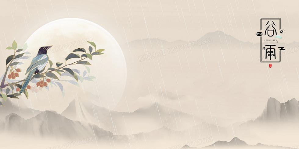本作品内容为中国风简约大气谷雨节气背景, 格式为 psd, 大小42 MB, 图片尺寸为4724 x 2362, 作品中背景图片无需修改, 源文件无水印,可以直接使用, 欢迎使用熊猫办公。 如认为平台内容涉嫌侵权,可通过邮件:tousu@tukuppt.com提出书面通知,我们将及时处理。