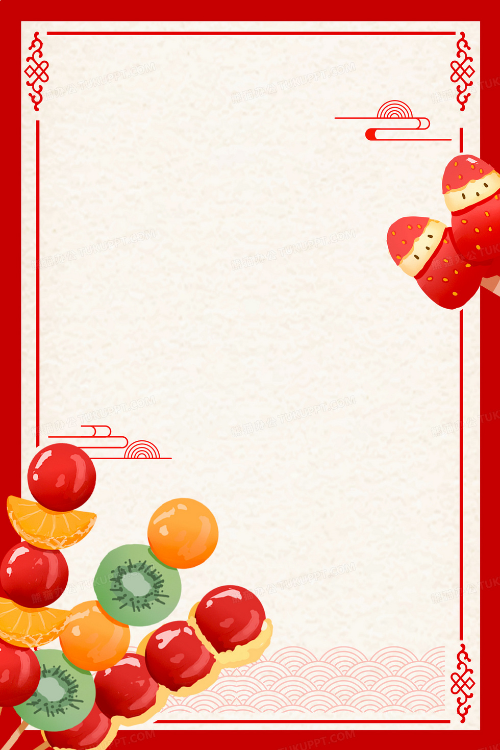 本作品内容为中国风冰糖葫芦边框背景, 格式为 psd, 大小25 MB, 图片尺寸为3543 x 5314, 作品中背景图片无需修改, 源文件无水印,可以直接使用, 欢迎使用熊猫办公。 如认为平台内容涉嫌侵权,可通过邮件:tousu@tukuppt.com提出书面通知,我们将及时处理。