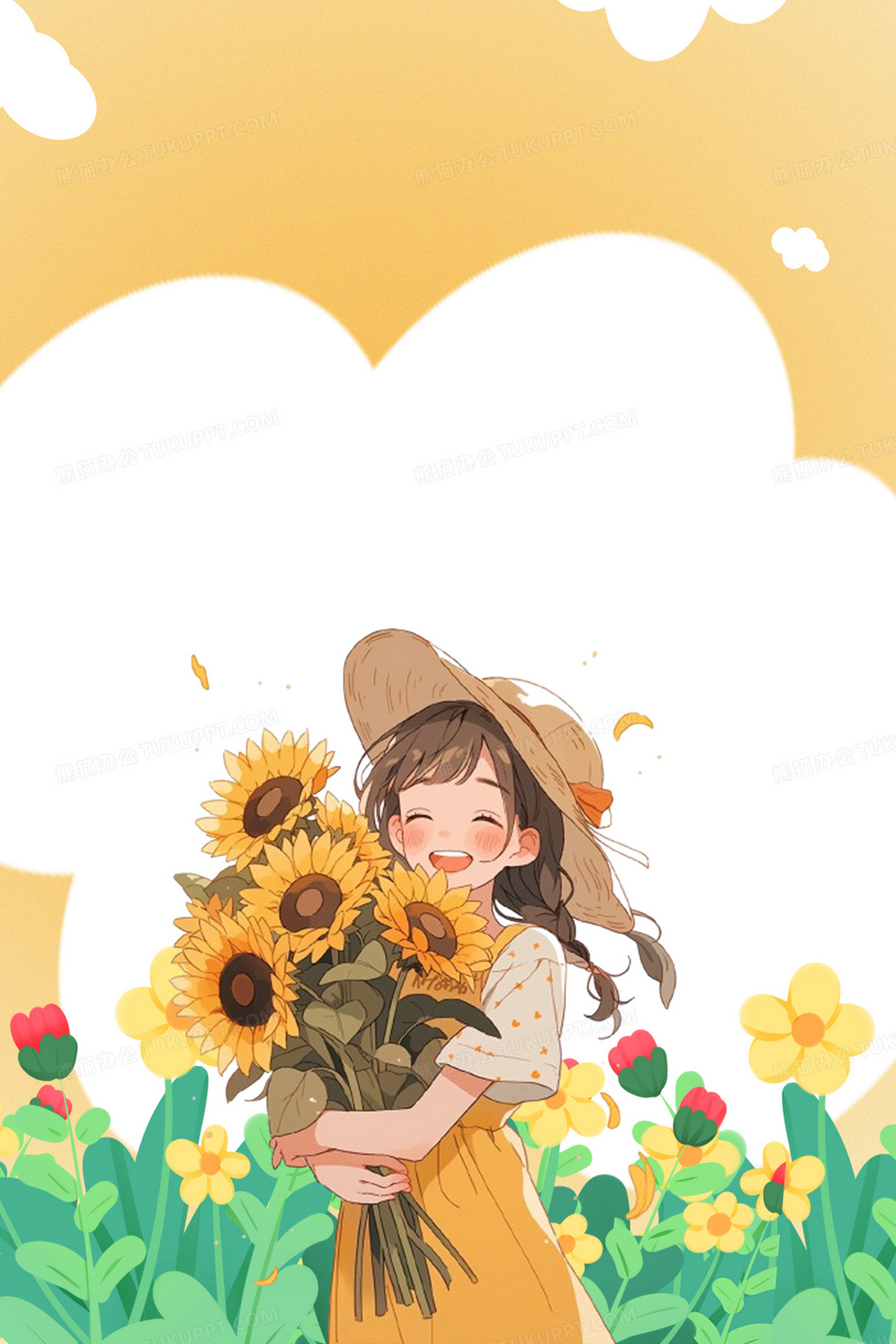 本作品内容为黄色手绘卡通女孩手捧向日葵合成背景, 格式为 psd, 大小127 MB, 图片尺寸为3543 x 5314, 作品中背景图片无需修改, 源文件无水印,可以直接使用, 欢迎使用熊猫办公。 如认为平台内容涉嫌侵权,可通过邮件:tousu@tukuppt.com提出书面通知,我们将及时处理。