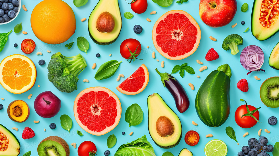 本作品内容为彩色素食日果蔬平铺视角插画, 格式为 jpg, 大小3 MB, 图片尺寸为2912 x 1632, 源文件无水印, 欢迎使用熊猫办公。 如认为平台内容涉嫌侵权,可通过邮件:tousu@tukuppt.com提出书面通知,我们将及时处理。