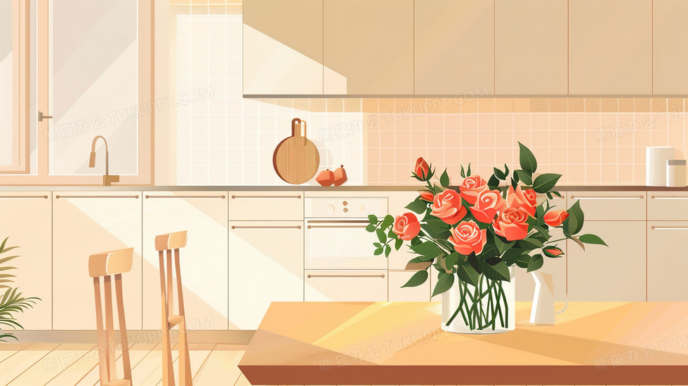 本作品内容为厨房餐桌上花瓶里的一束玫瑰花插画, 格式为 jpg, 大小2 MB, 图片尺寸为2912 x 1632, 源文件无水印, 欢迎使用熊猫办公。 如认为平台内容涉嫌侵权,可通过邮件:tousu@tukuppt.com提出书面通知,我们将及时处理。