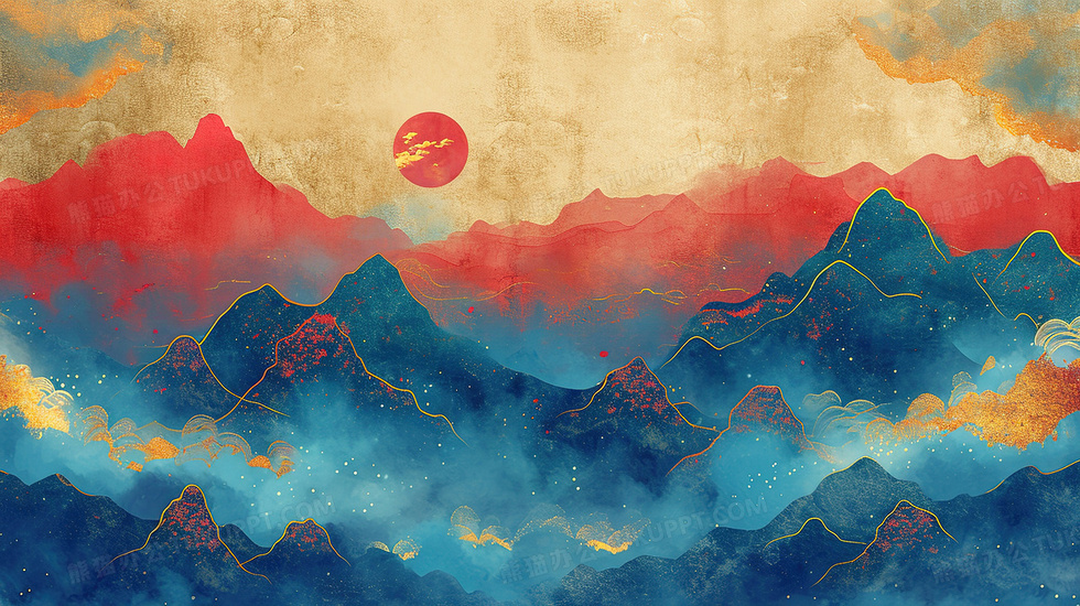 本作品内容为唯美彩色国潮鎏金山水画插画, 格式为 jpg, 大小5 MB, 图片尺寸为2912 x 1632, 源文件无水印, 欢迎使用熊猫办公。 如认为平台内容涉嫌侵权,可通过邮件:tousu@tukuppt.com提出书面通知,我们将及时处理。