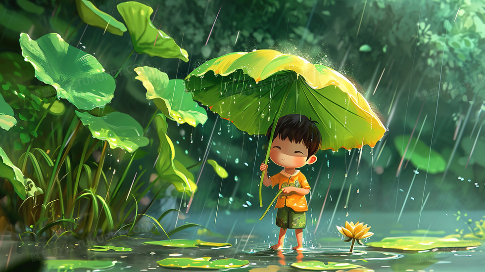 本作品内容为男孩雨中荷叶撑着打伞插画, 格式为 jpg, 大小3 MB, 图片尺寸为2912 x 1632, 源文件无水印, 欢迎使用熊猫办公。 如认为平台内容涉嫌侵权,可通过邮件:tousu@tukuppt.com提出书面通知,我们将及时处理。