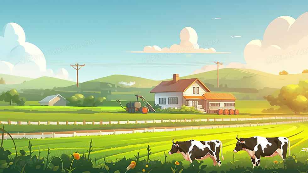 本作品内容为绿色唯美乡村田园奶牛牧场风景插画, 格式为 jpg, 大小3 MB, 图片尺寸为2912 x 1632, 源文件无水印, 欢迎使用熊猫办公。 如认为平台内容涉嫌侵权,可通过邮件:tousu@tukuppt.com提出书面通知,我们将及时处理。