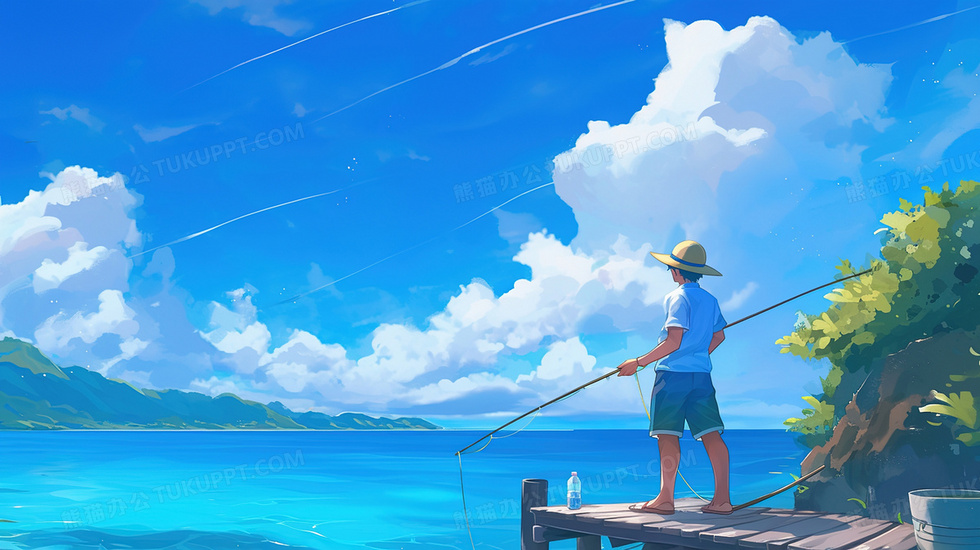 本作品内容为蓝天白云海边钓鱼的男子插画, 格式为 jpg, 大小3 MB, 图片尺寸为2912 x 1632, 源文件无水印, 欢迎使用熊猫办公。 如认为平台内容涉嫌侵权,可通过邮件:tousu@tukuppt.com提出书面通知,我们将及时处理。