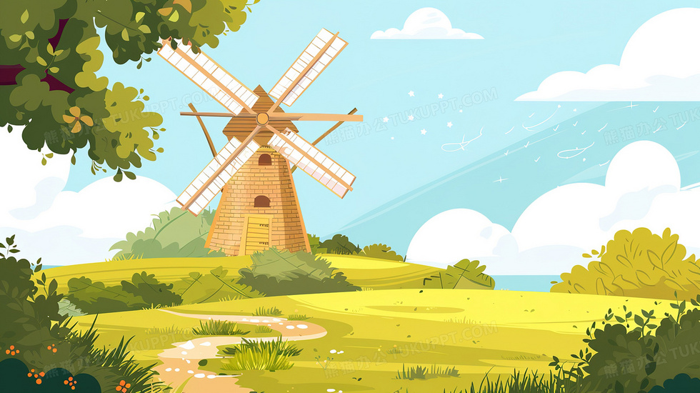 本作品内容为草地上的风车房插画, 格式为 jpg, 大小2 MB, 图片尺寸为2912 x 1632, 源文件无水印, 欢迎使用熊猫办公。 如认为平台内容涉嫌侵权,可通过邮件:tousu@tukuppt.com提出书面通知,我们将及时处理。