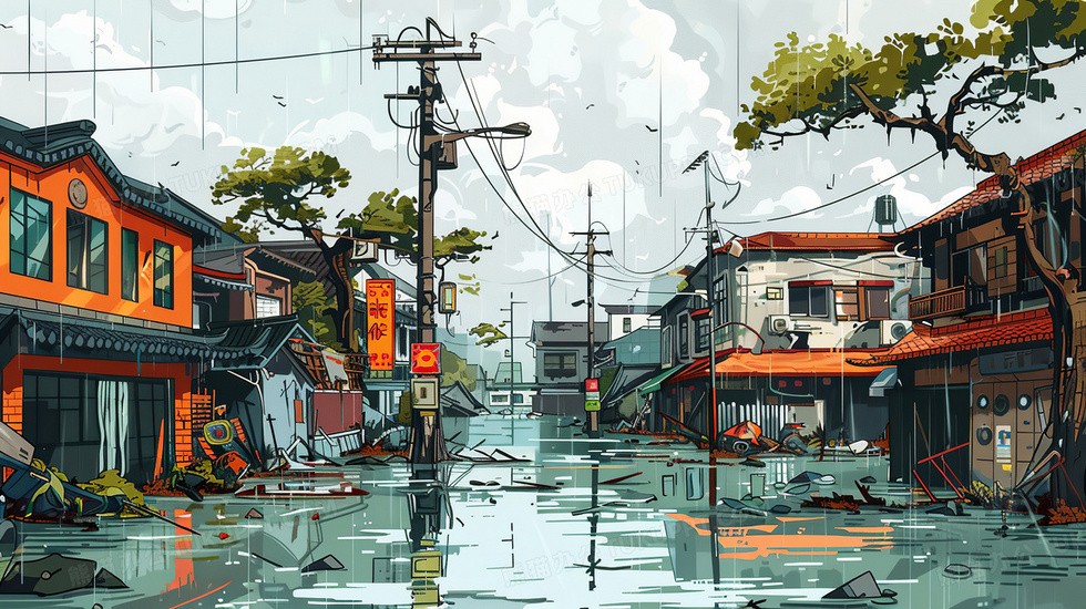 本作品内容为夏季水淹街道手绘插画, 格式为 jpg, 大小4 MB, 图片尺寸为2912 x 1632, 源文件无水印, 欢迎使用熊猫办公。 如认为平台内容涉嫌侵权,可通过邮件:tousu@tukuppt.com提出书面通知,我们将及时处理。