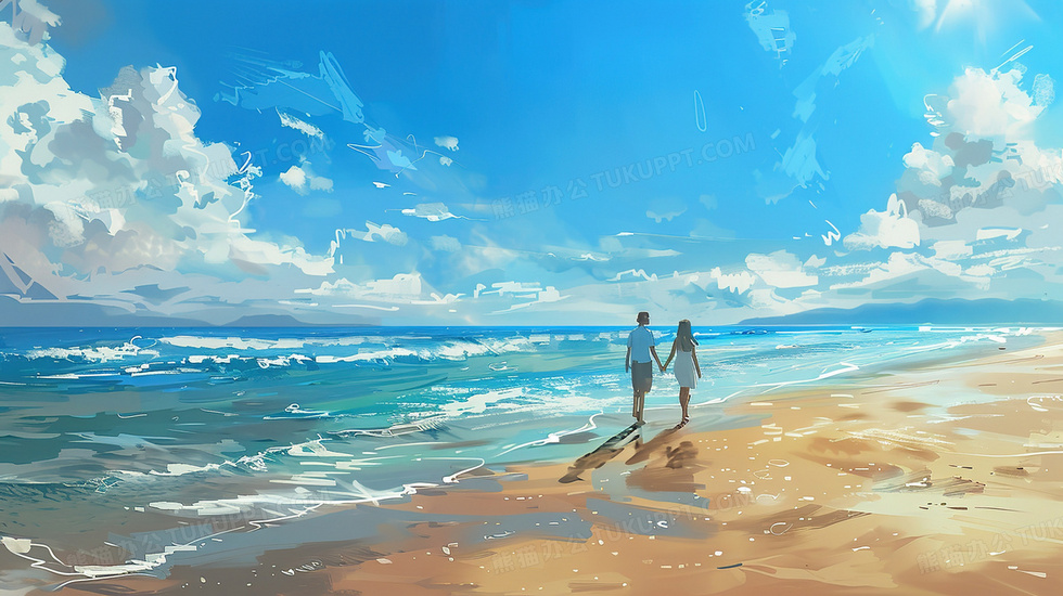 本作品内容为夏天情侣海边度假插画, 格式为 jpg, 大小3 MB, 图片尺寸为2912 x 1632, 源文件无水印, 欢迎使用熊猫办公。 如认为平台内容涉嫌侵权,可通过邮件:tousu@tukuppt.com提出书面通知,我们将及时处理。