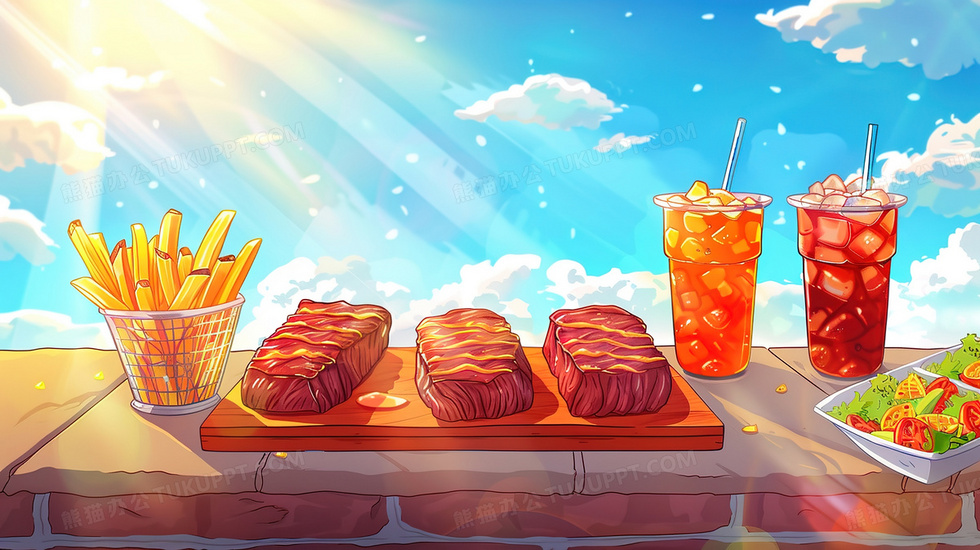 本作品内容为美食烤肉饮料插画, 格式为 jpg, 大小3 MB, 图片尺寸为2912 x 1632, 源文件无水印, 欢迎使用熊猫办公。 如认为平台内容涉嫌侵权,可通过邮件:tousu@tukuppt.com提出书面通知,我们将及时处理。